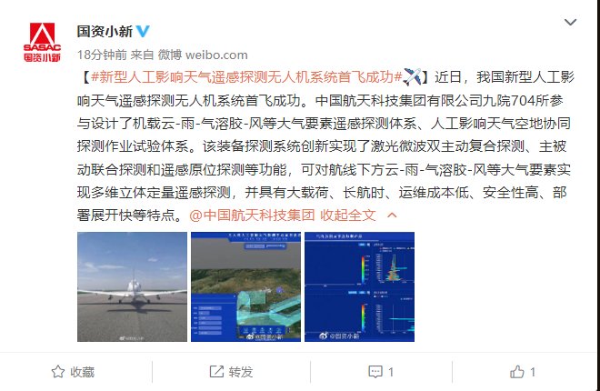 这标志着我国首款中空大载量长航时人工影响天气遥感探测作业无人机系统首飞试验任务圆满成功。